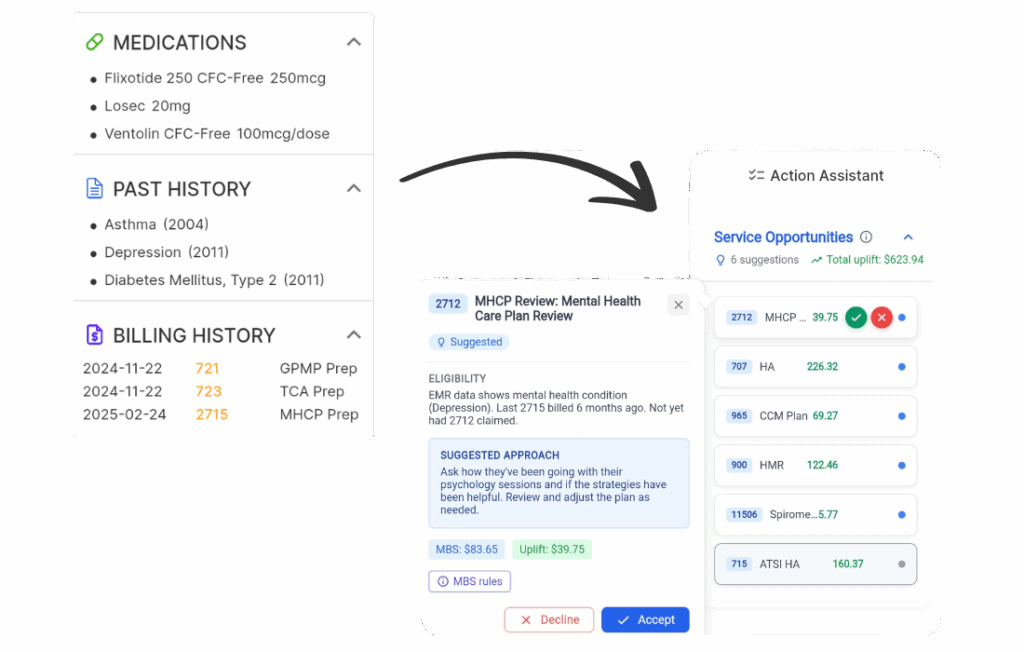 Surface eligible Medicare services from the moment a consult begins. In live practice trials, doctors saw a 22–67% uplift in billings per GP — without working longer hours.